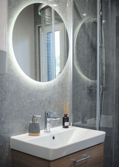 De gevel van de Basic-modellen is afgewerkt met duurzaam en weerbestendig Vifront vinyl sidings. Het interieur is afgewerkt met hoogwaardige materialen, zoals vinyl wandpanelen en MDF-panelen.