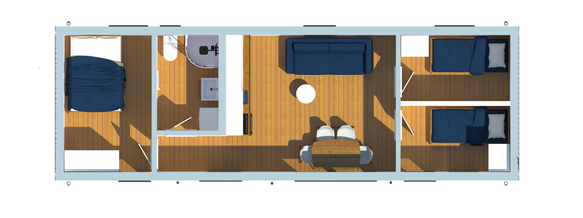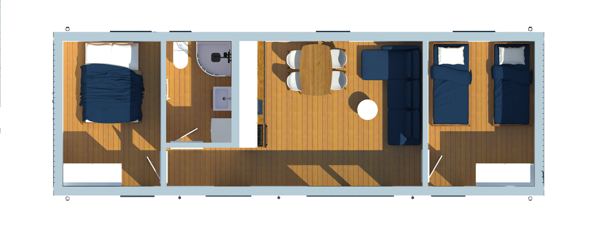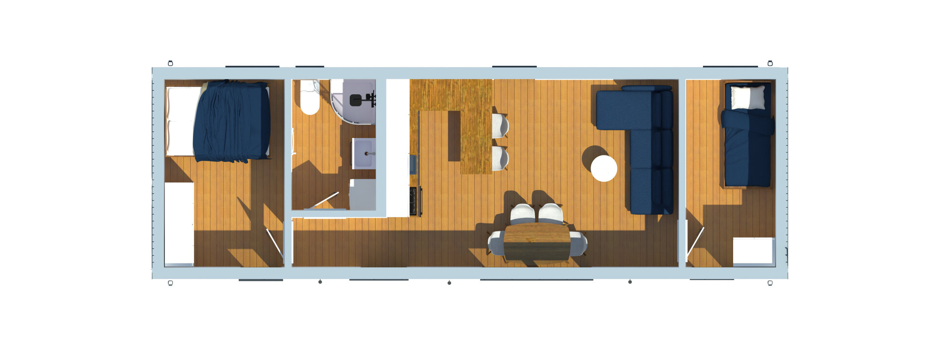 Elk huis is voorzien van een complete badkamer, uitgerust met alle benodigde apparatuur. Voor volledige functionaliteit van het huis is alleen aansluiting op de nutsvoorzieningen vereist.